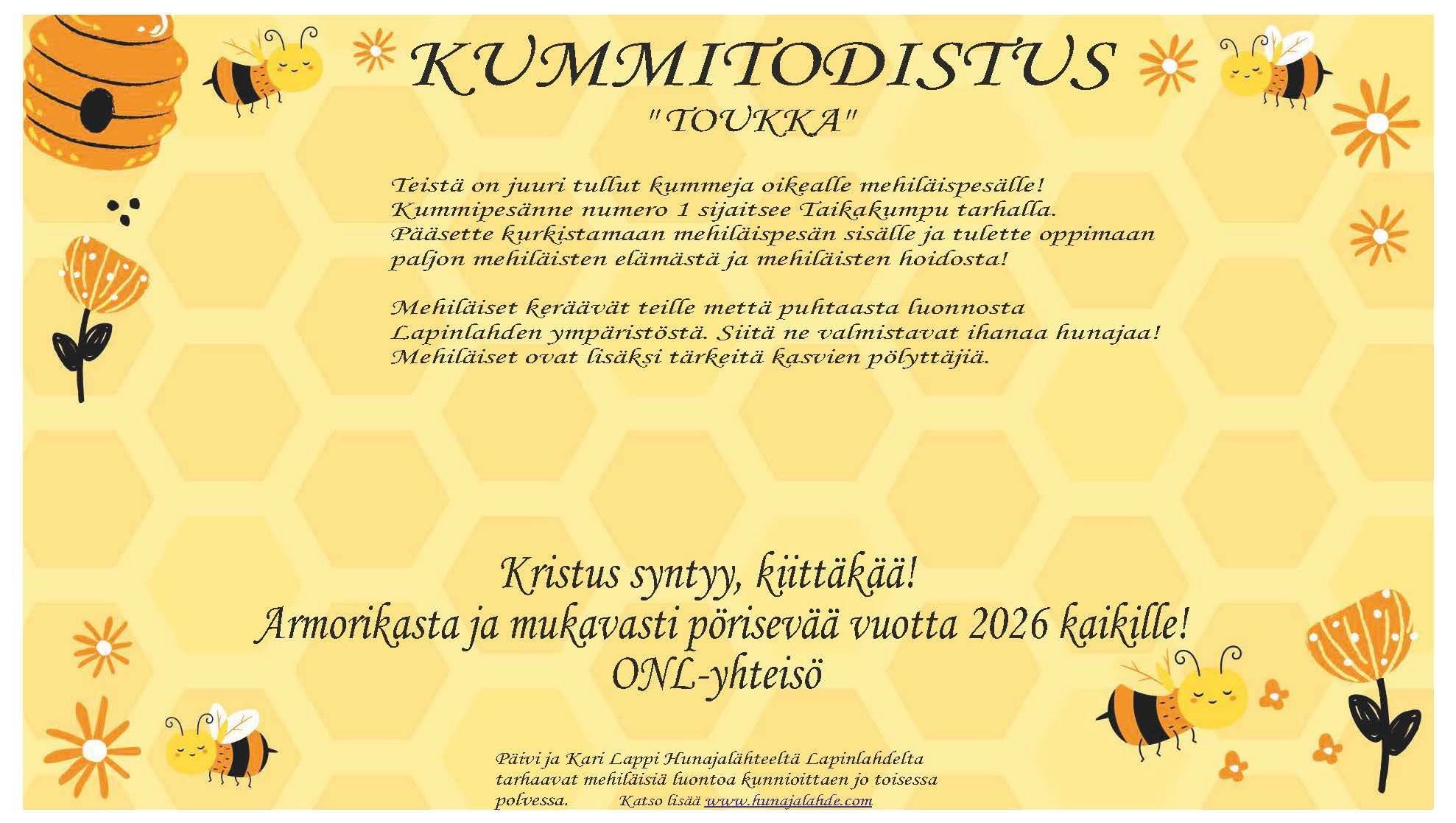 Tämä on joululahja kaikille teille, sekä myös luonnolle! Mehiläiset nimittäin sekä valmistavat herkullista hunajaa, että ovat myös tärkeitä kasvien pölyttäjiä. Kummipesämme sijaitsee Ylä-Savossa Lapinlahdella, Hunajalähde Oy:n tarhalla.
