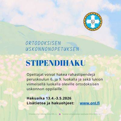 Ortodoksisten nuorten liitto ONL ry julistaa haettavaksi stipendejä peruskoulun 6. ja 9. luokalla ja sekä lukiossa viimeistä (3. tai 4.) vuotta opiskeleville ortodoksisen uskonnon oppilaille.