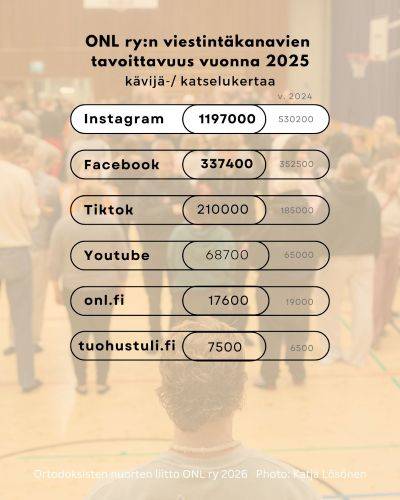 Tilastot Ortodoksisten nuorten liitto ONL ry:n tärkeimpien viestintäkanavien tavoittavuudesta vuonna 2025 kertovat liiton sosiaalisen median katselukertojen kasvusta. Kanavat tavoittavat yhä laajemman yleisön ja toimivat tärkeänä kohtaamispaikkana nuorille ortodokseille ja ortodoksisuudesta kiinnostuneille.